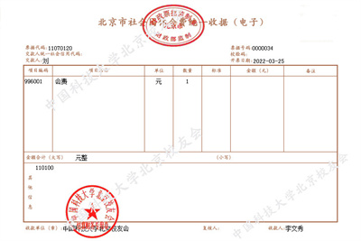 B)交纳会费后,我们将为您出具北京市社会团体会费统一收据(电子),样式如下:
