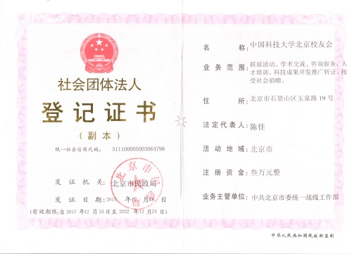 1)中国科技大学北京校友会,注册于北京民政局,是中国科学技术大学在内地唯一合法、注册并拥有税前扣除与非营利组织免税资格的校友会。2019年被北京市民政局认定为五年来全市唯一一家5A级大学校友会。