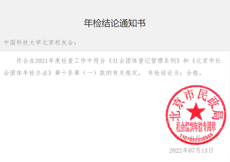 7月13日,北京校友会通过北京市社会组织服务系统获得年检结论通知书,中国科技大学北京校友会通过北京市民政局的社会团体2021年度年检,年检结论为“合格”。年检结论表明,2021年北京校友会的工作严格遵守国家的相关法规政策,工作规范。同时,北京校友会也获得2021年公益性捐赠税前扣除资质。您可点击为您减税!公益性捐赠税前扣除资格再获批获取2021年度公益性捐赠税前扣除材料。