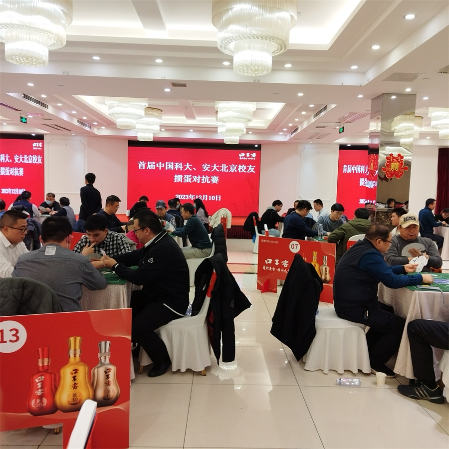 12月10日下午,首届中国科大、安大北京校友掼蛋对抗赛已在丰台区顺利进行,双方总计有近70位校友参赛。中国科大代表队15组选手出战,安徽大学代表队19组选手出战。最终,科大仅有两组选手入围前六名,分别获得亚军和季军,冠军小组来自安大。