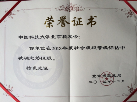 2013年8月,北京校友会接受北京市民政局2013市级社会组织评估。2014年1月结果揭晓:北京校友会荣获北京市4A级社会组织资质,同时也是荣获4A及以上社会组织中唯一的中国名牌大学校友会。据查证,获得4A级社会组织、公益捐赠税前扣除与非营利组织免税资格认定等资格的北京市大专院校校友会,仅中国科技大学北京校友会一家。