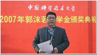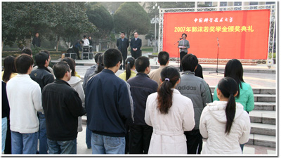 董雨宣读了学校相关表彰文件及2007年“郭沫若奖学金”获得者名单。经各院系初审、学生工作处资格审查,11月16日,校学生专项奖学金评审委员会终审决定,26名同学从1800多名2004级本科毕业班学生中脱颖而出,荣获2007年“郭沫若奖学金”。