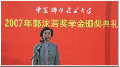 鹿明副书记在颁奖典礼上对获得“郭沫若奖学金”的同学表示热烈祝贺。她强调,“郭沫若奖学金”是科大本科生最高荣誉奖,获得这一奖项的同学,是科大的佼佼者,是科大的骄傲。“郭沫若奖学金”是1980年由国务院批准的新中国在高校设立的第一个奖学金,由首任校长郭沫若先生捐出的15万元稿费作为基金。随着社会经济的发展,通过基金利息、郭沫若家人捐赠等形式,这一奖项的额度也相继有所增加,但由于本金严重不足,奖金额度与荣誉远不相称。