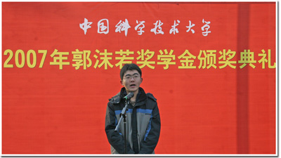 2004级少年班学生周融代表获奖学生发言,感谢学校的培养。他表示,科大就象学生的再生父母,她拥有的光荣传统对学生的成长起到了巨大的作用,严谨治学的老师和刻苦学习的良好学风,激励着学生踏实学习、不断完善,为今后发展打下坚实的基础。周融表示,将带着对科大的美好记忆走上人生舞台,发扬“不甘人后”的精神,灿烂地燃烧自己的青春和才华。