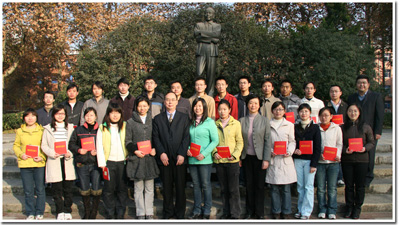 在雄壮激昂的校歌声中,朱清时校长逐一为“郭沫若奖学金”获得者颁发获奖证书并与他们分别合影。