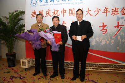 宋光天、史济怀教授接受朱清时校长颁发的少年班教育荣誉奖(左图);少年班系主任陈卿教授(右图)