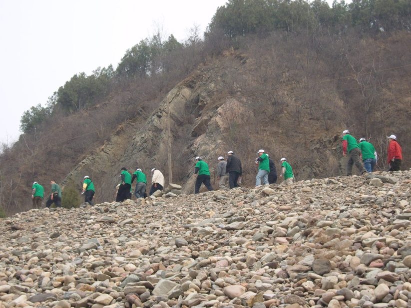 中午酒足饭饱之后,校友迤逦盘旋沿小路上山植树(唯872张捷沿鹅卵乱石堆冒进,几乎引起山崩,其玉体俯视益发丰满圆润)。校友在两个小时之内,种下的超过一百余颗树苗(大多数校友不事稼穑,能种两颗不错了),并在树苗上挂放了科大50周年校庆标识。唯下山去水路途遥远,僧多桶少。然科大校友,建校即信奉“科学的高峰要高到无穷”,爬个300米山路,岂能难到英雄汉?上山路中,涌现了多位劳动模范——王利锋是唯一双手各提一桶水上山者,也是唯一雇佣童工者(王总让两位不到10岁的孩子帮助扛担子,并以妖言“坚持就是胜利”糊弄儿童。王总明显违反劳动法的行为,应受谴责,当以其公司动画片赔偿孩子们)。王新卫、宋健(几乎掉进潭中)、刘朝俊(99级的小师弟,勤奋可嘉)。