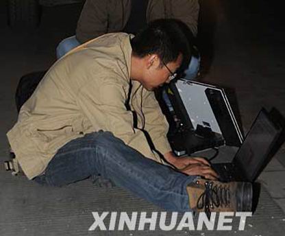 5月13日凌晨,新华社记者陈燮在前往北川县城的途中遇阻后,不顾两边山体轰隆隆垮塌,冷静地在公路上借助车灯,用海事卫星向总社发稿。 黄堃摄