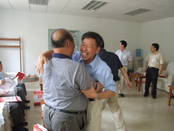 虎啸玉泉——黄吉虎重出江湖,见人就抱。被抱者为王炽昌。(摄影:新华社姜岩)
