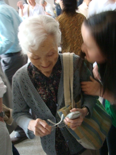 李佩教授满头银发,她不要学生志愿者帮助,坚持亲自拎着校庆纸袋。(摄影:冯侦探)