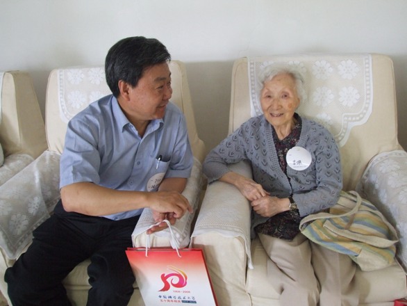 饶子和(左)问候李佩教授(右)。(摄影:新华社姜岩)