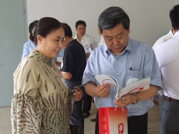 饶子和校友阅读新创基金会年报。(摄影:新华社姜岩)