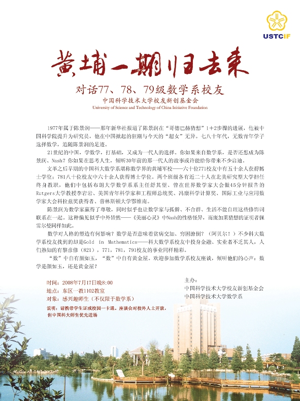 2008-07-23 上一篇: 熊辉做报告激励少年班学子 下一篇: 黄埔一期大话数学