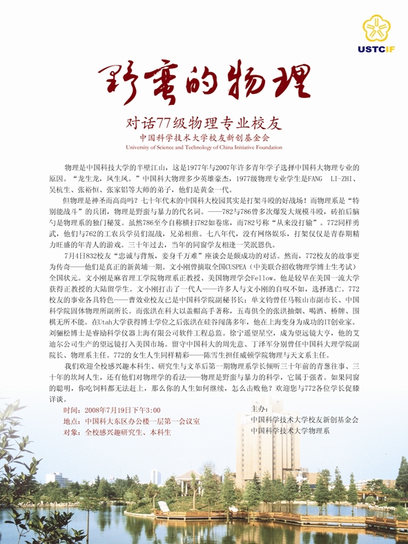 物理专业校友座谈会海报。——7月18日晚8点,772校友临时决定与学生座谈。晚11点,海报打印完毕,报张贴完毕是当晚12点。19日上午774和782校友决定加盟助阵,海报未及修改。