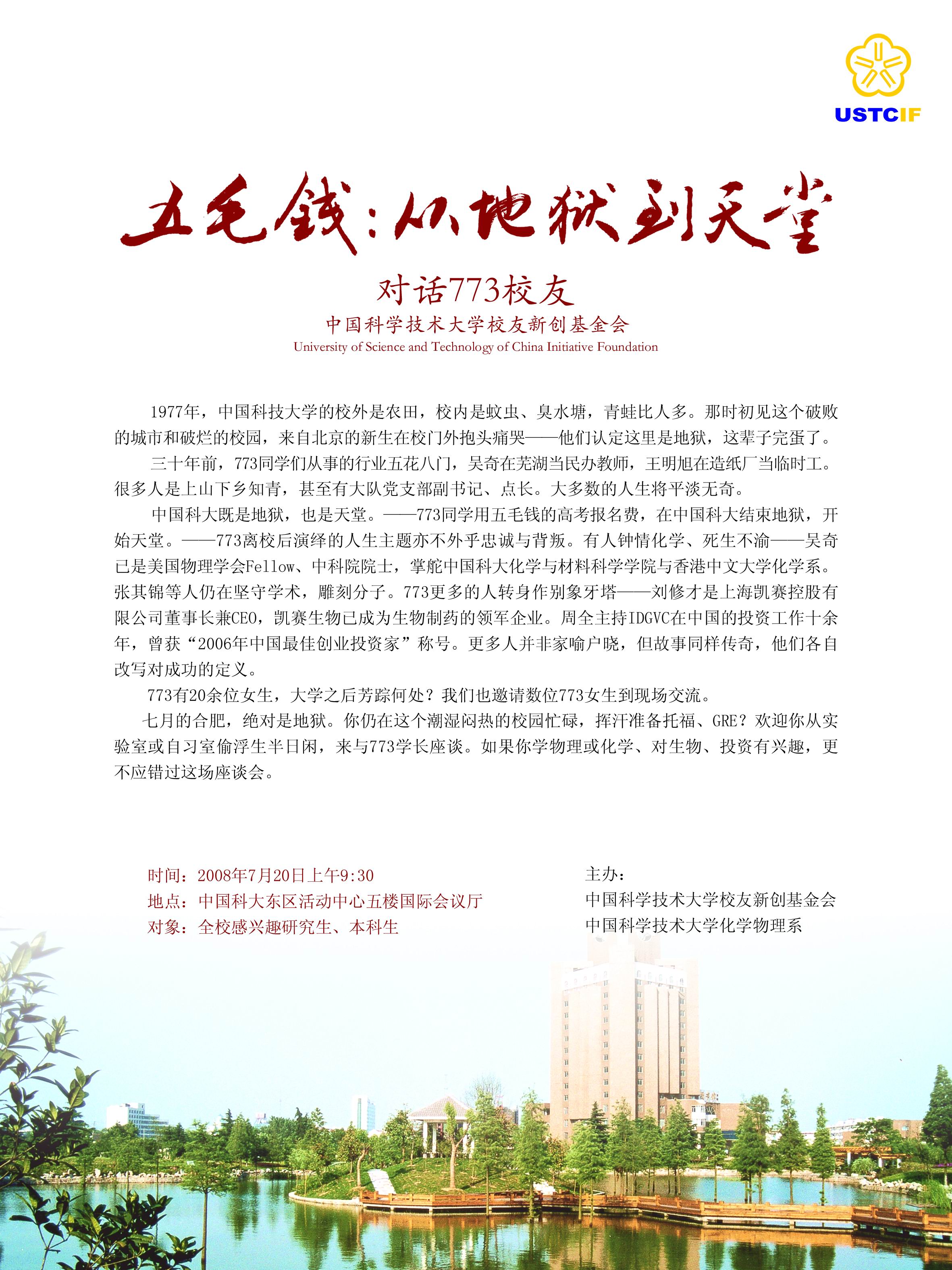 7月20日上午,773校友的座谈会在东区活动中心国际会议厅进行,章晓华、周建新、吴奇(中科院院士、美国物理学会Fellow)、钟慧莉(中科集团资产管理部总经理)、陈予英、王冰梅、刘修才(上海凯赛控股有限公司董事长)、周全(IDGVC)出席座谈。钟慧莉播放了记载她三十年经历的《在工作中成长-成熟》的PPT,引起了同学们的一阵阵惊叹。刘修才介绍求学和创业的经历,他至今感激30年前邓小平恢复高考,使得人生轨迹得以改变。他鼓励同学要做梦。而周全回答CCTV《赢在中国》的节目时称“电视上创业都不靠谱”。吴奇院士告诫青年同学,不能缺少“Will”与“Determination”。章晓华则认为“Passion is important”。
