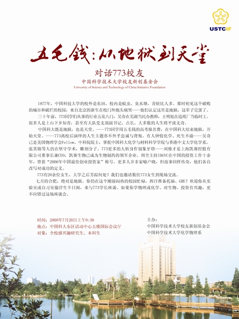 2008年7月19日至20日,400多位从海内外返校的中国科技大学77、78、79级校友,回到母校和当年的老师和同学们举办“相聚2008”——纪念入学三十周年活动。新创基金会邀请77、78、79级校友举办四场学生座谈会。