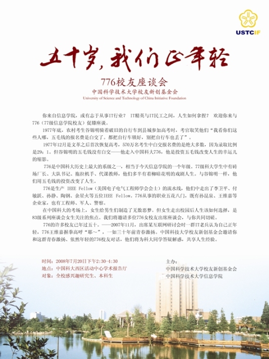 776校友座谈会海报《五十岁,我们正年轻》。776派出30人的庞大阵容对话科大学生。了解到同学的热情之后,许多校友推迟一天离开合肥参加座谈。而孙崑泉等多位校友带着行李来到现场。