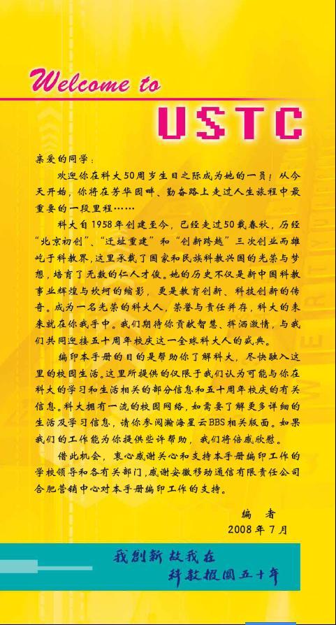 中国科技大学每年编印《校园手册》,帮助新生了解科大,融入校园生活。2008年8月14日开始,中国科技大学2008级本科新生开始报道时,每人领到一份《校园手册》。