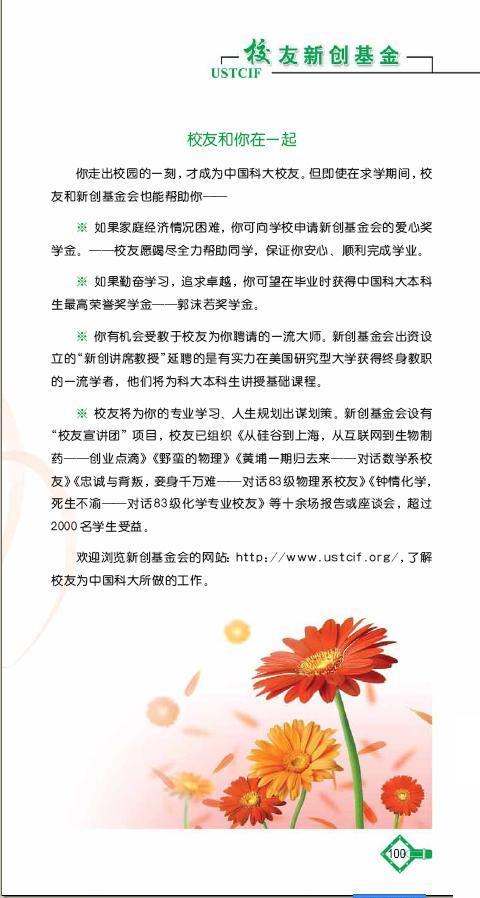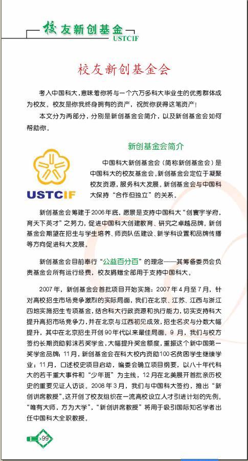 2008年新版《中国科学技术大学校园手册》(简称《校园手册》)刊登专文介绍新创基金会。