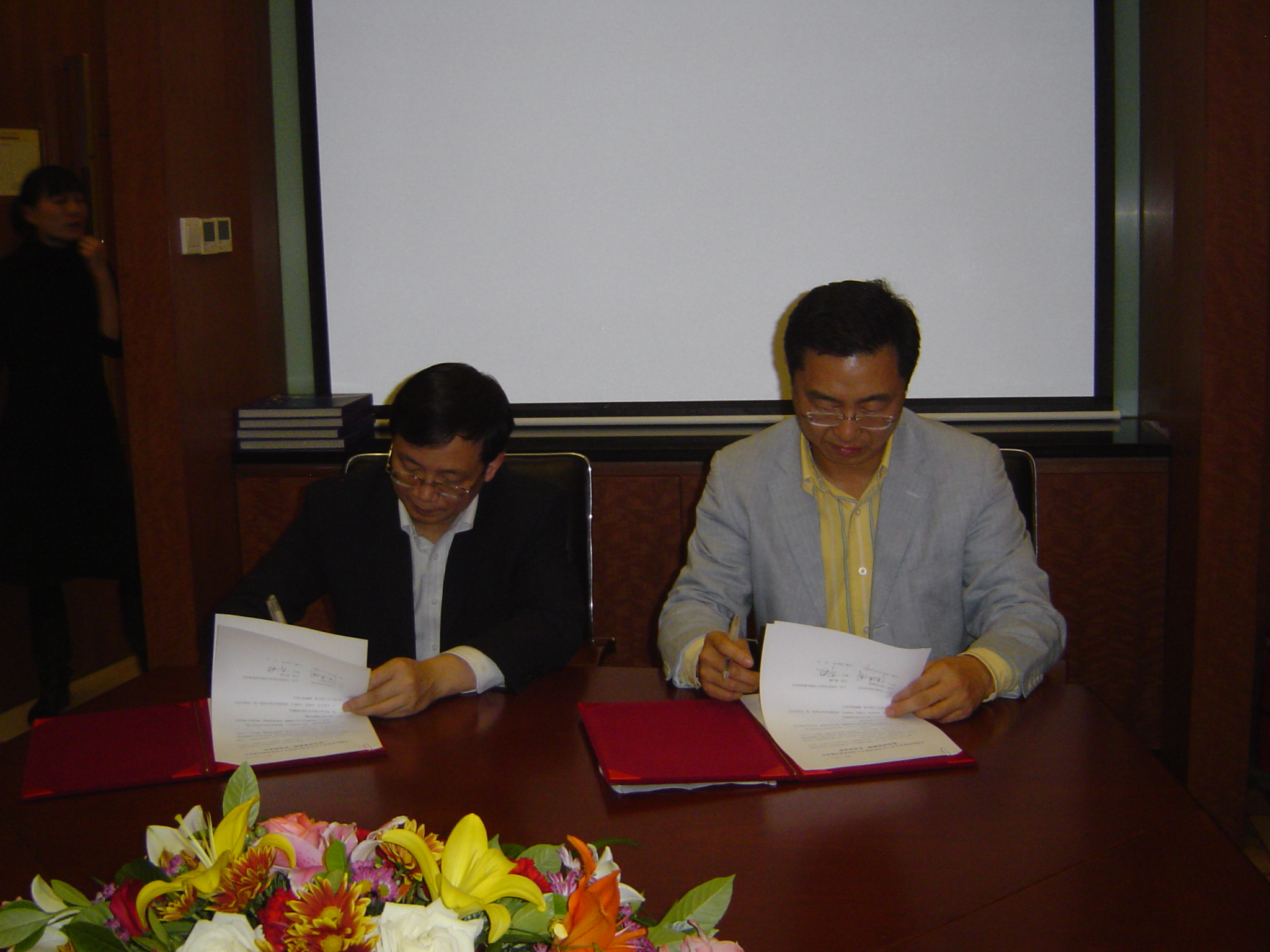 侯建国校长(前排左)与郭元林(前排右)签署《“新创讲席教授”补充协议书》时交换文本。后排左起许四清、吴亦兵、蒋澄宇、周全。