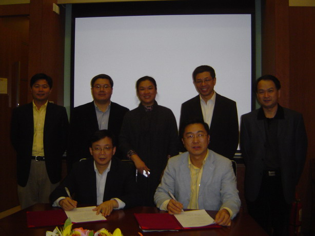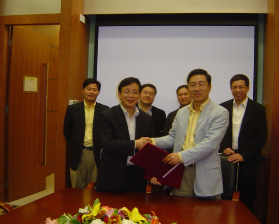 侯建国校长(前排左)与郭元林(前排右)签署《“新创讲席教授”补充协议书》。后排左起许四清、吴亦兵、蒋澄宇、周全、马扬。