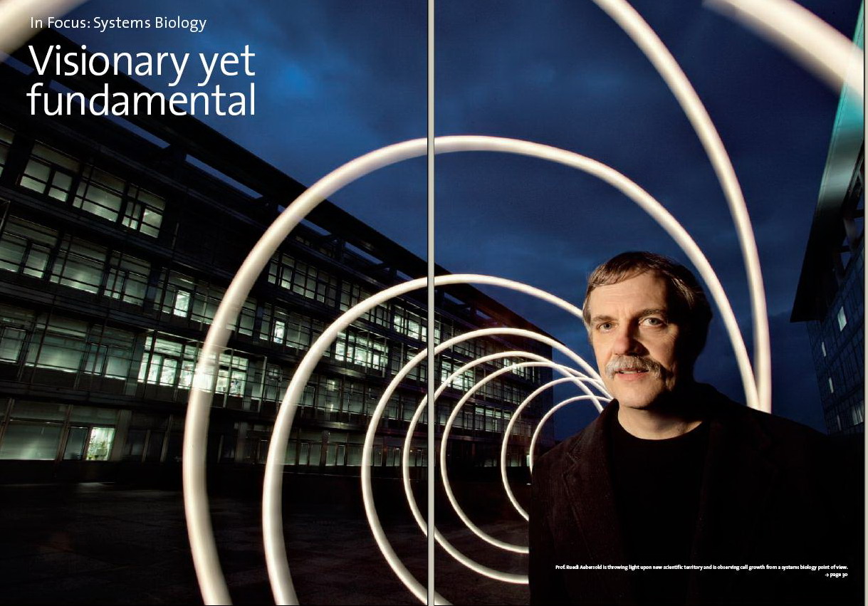 引自ETHZ2006年年报,系统生物学家穿越未来?原文标题:聚焦系统生物学:梦幻却又本原。原文标注:Ruedi Aebersold教授开拓着新的科学版图,他正以系统生物学视角观察细胞生长。这张照片最好的表达这层“梦幻却又本原”的寓意。