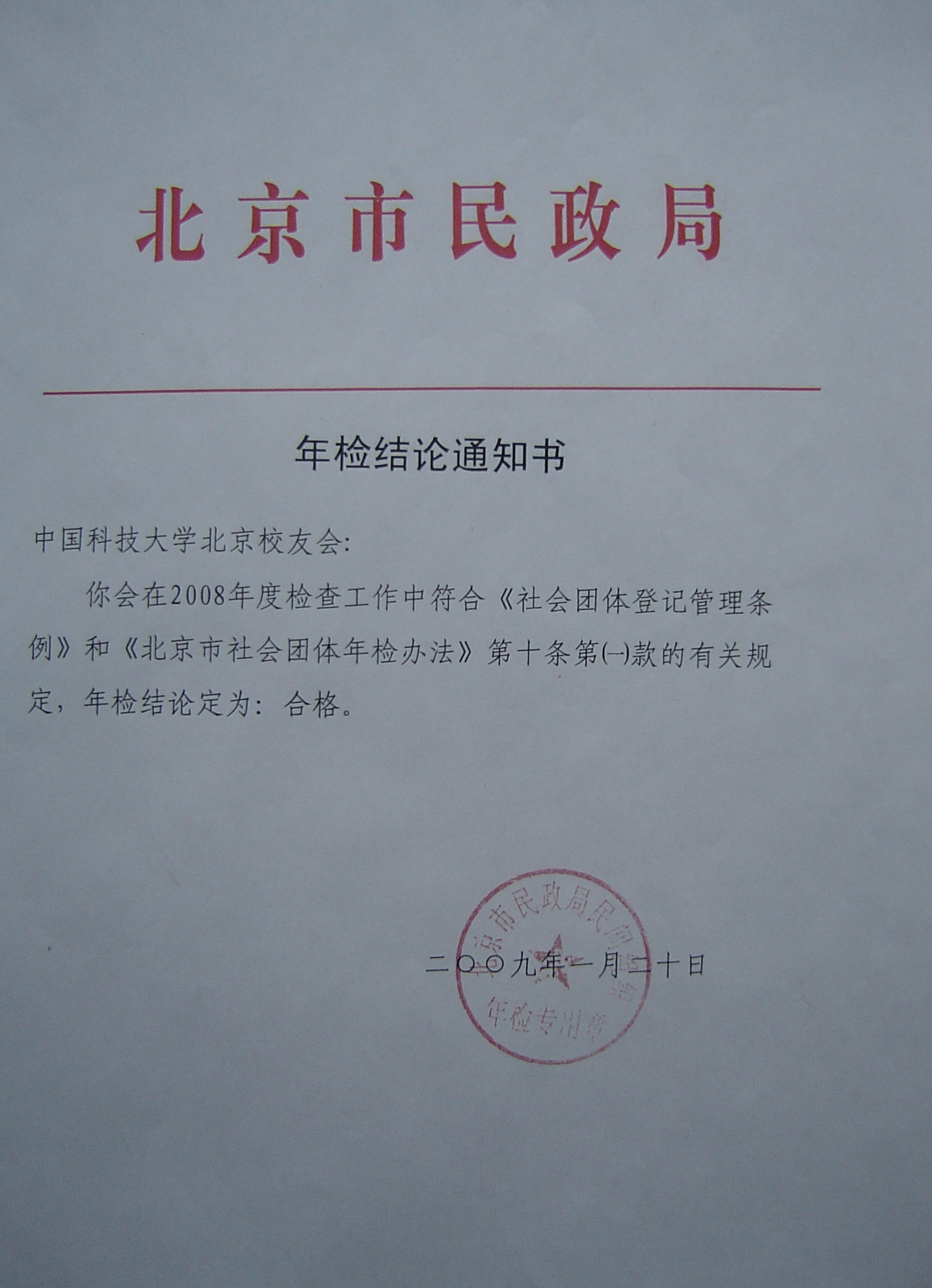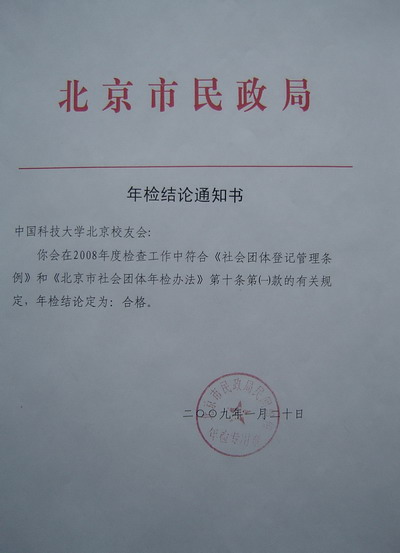 2008年1月23日,中国科技大学北京校友会在北京市民政局率先通过2008年度年检,年检结论为“合格”。年检结论标明,2008年北京校友会的工作严格遵守国家的相关法规政策,工作规范。