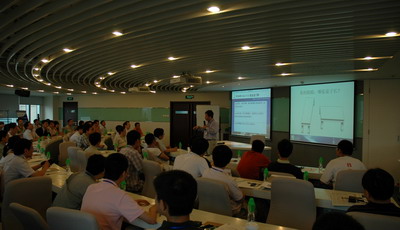 百度公司商业分析部总监诸达晨(9300、斯坦福大学博士)向曹辉宁教授提问:长江的MBA有无中国特色? 画面第一排右二黑色衣服者为87少叶一火(阿里巴巴中国雅虎口碑网负责人),长江商学院EMBA在读学员。龙门阵的前一天,他在同一间教室上课。