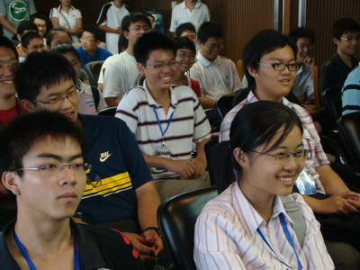 几位毕业不久的优秀毕业生代表也来到现场,包括05级物理学院王肖肖(耶鲁大学)、05级信息学院郭沫若奖学金任广鑫(微软亚洲研究院)、0200冯侦探(中国科学院声学所博士生)与0200任凭(中国科学院高能所博士生)。新同学们对刚刚离校不久的新毕业生有极大兴趣,纷纷提问,询问在中国科大的学习与生活。