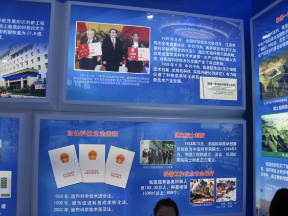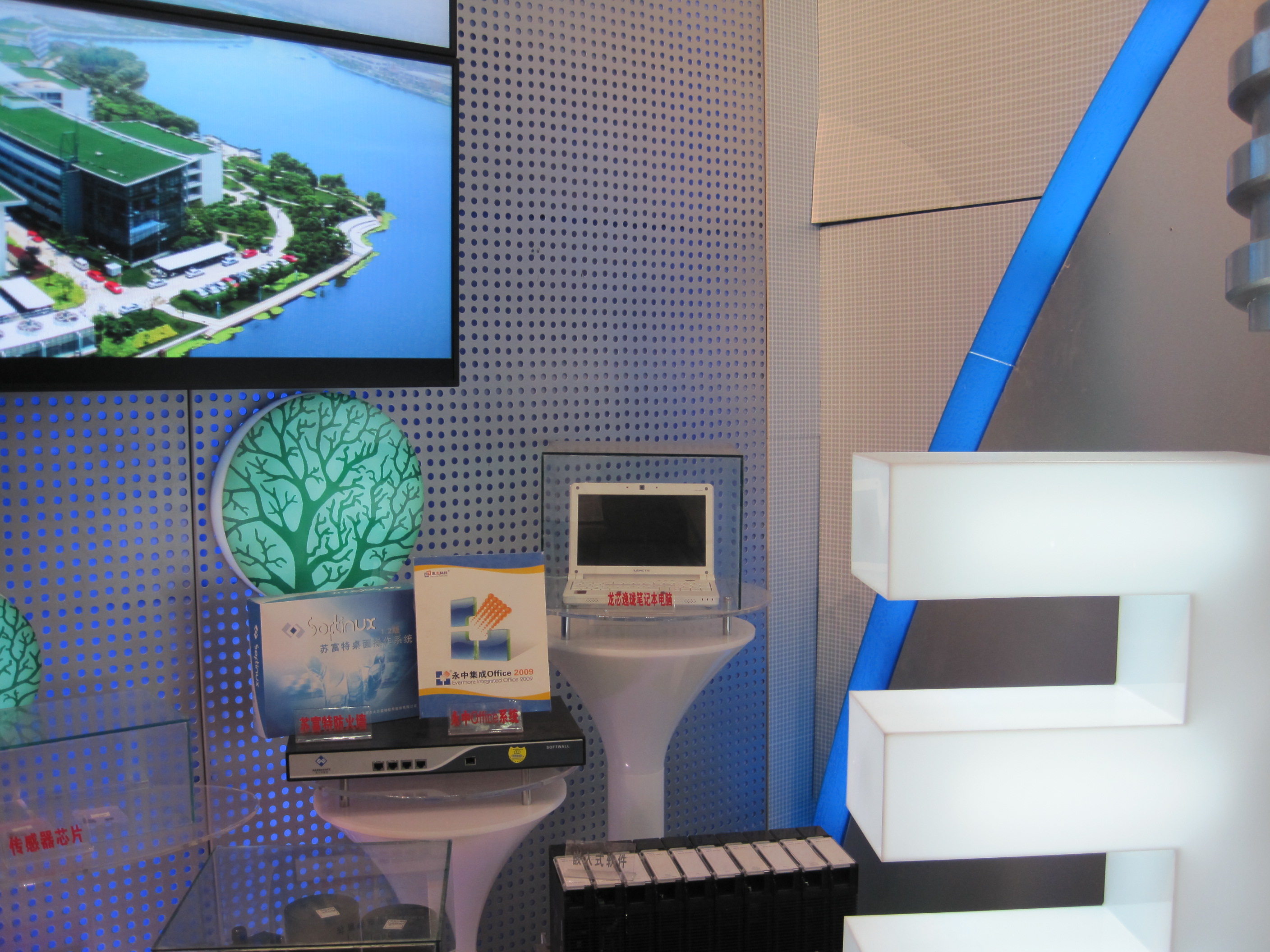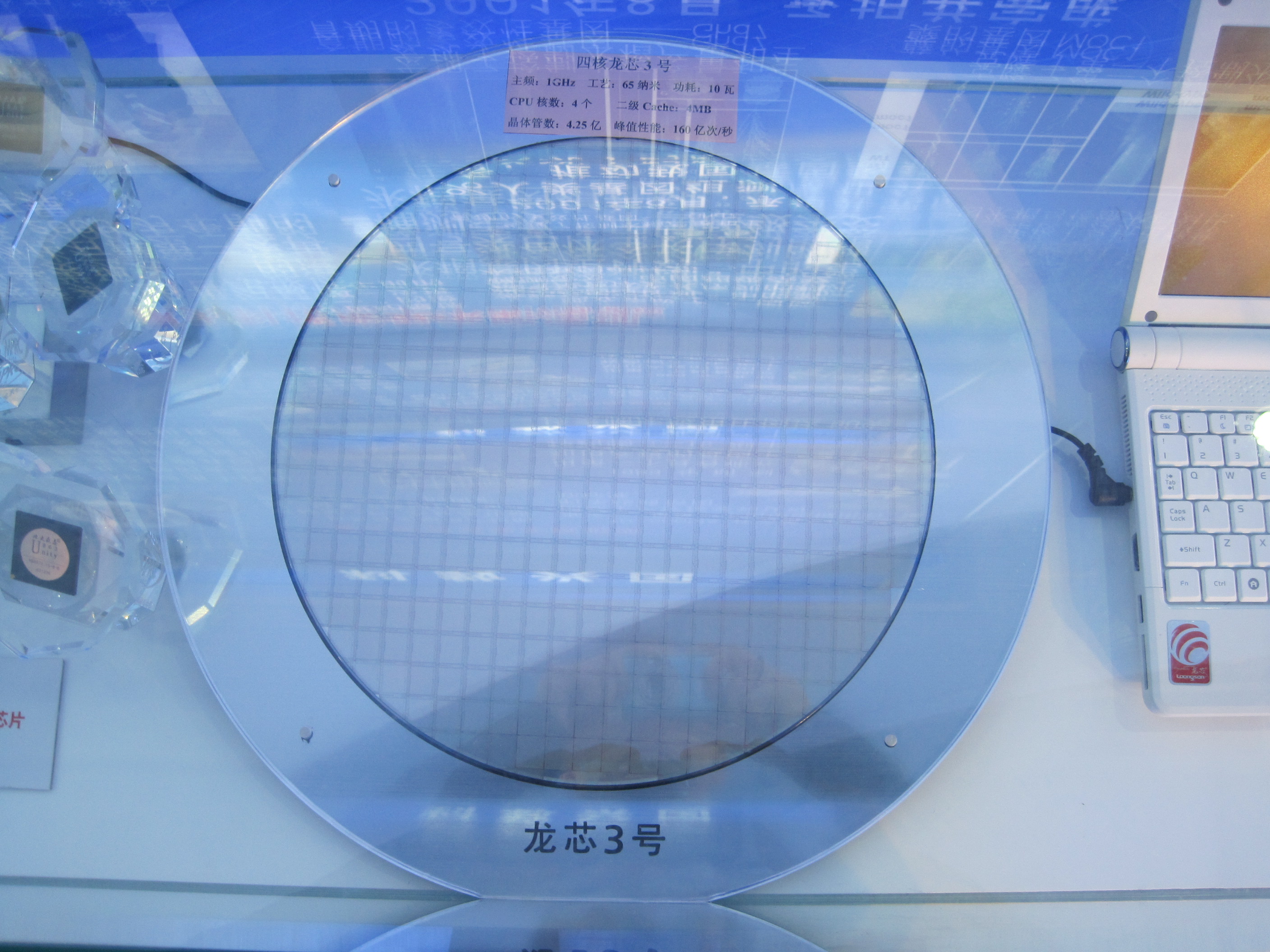 中国拥有自主知识产权首颗通用CPU——龙芯在展览不同地区出现多次。龙芯项目首席科学家胡伟武为8611校友,其团队中国科大年轻校友堪称中流砥柱。龙芯团队中有约20名科大校友。中图为龙梦笔记本电脑,出品商江苏龙梦公司总经理为张福新(9500),为龙芯研发团队核心成员,连续当选中国科学院、江苏省、苏州市、常熟市十大杰出青年。而右图为龙芯笔记本电脑再次出现在综合展区经济成就版块。