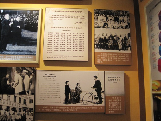 科教展厅入口处,图中左侧的玻璃柜台为中国科技大学提供的郭永怀烈士“两弹一星”勋章,图中最右下照片为中国科技大学营养餐厅。