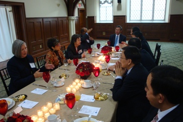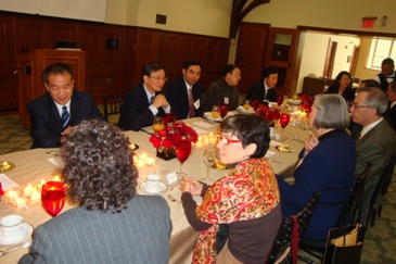 在晚宴中,代表团与几位Temple大学教授交换了双方研究情况。戴海龙介绍了陶荣甲教授近期关于磁场影响石油输运科研突破。这项突破以100万美元被转让,陶荣甲获得50万美元。戴海龙打趣“做校友工作哪位朋友就坐陶教授边上应该找他”。