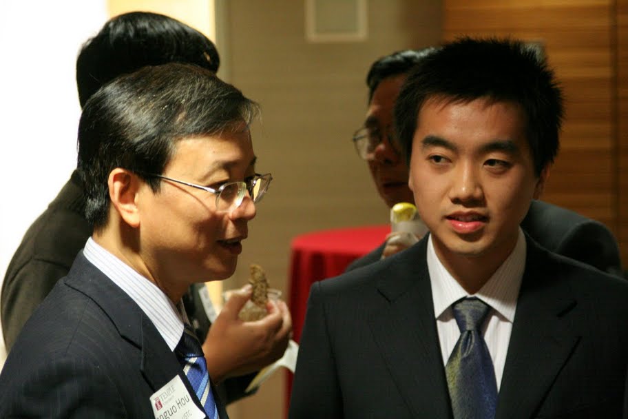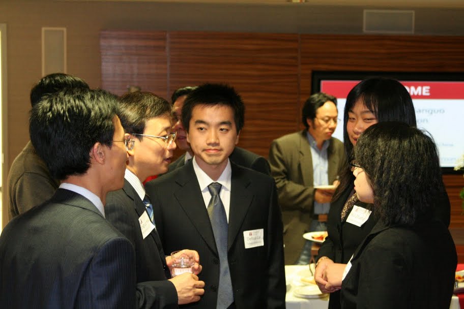 Temple大学为科大举行的招待会中:侯建国校长与年轻校友们谈话。