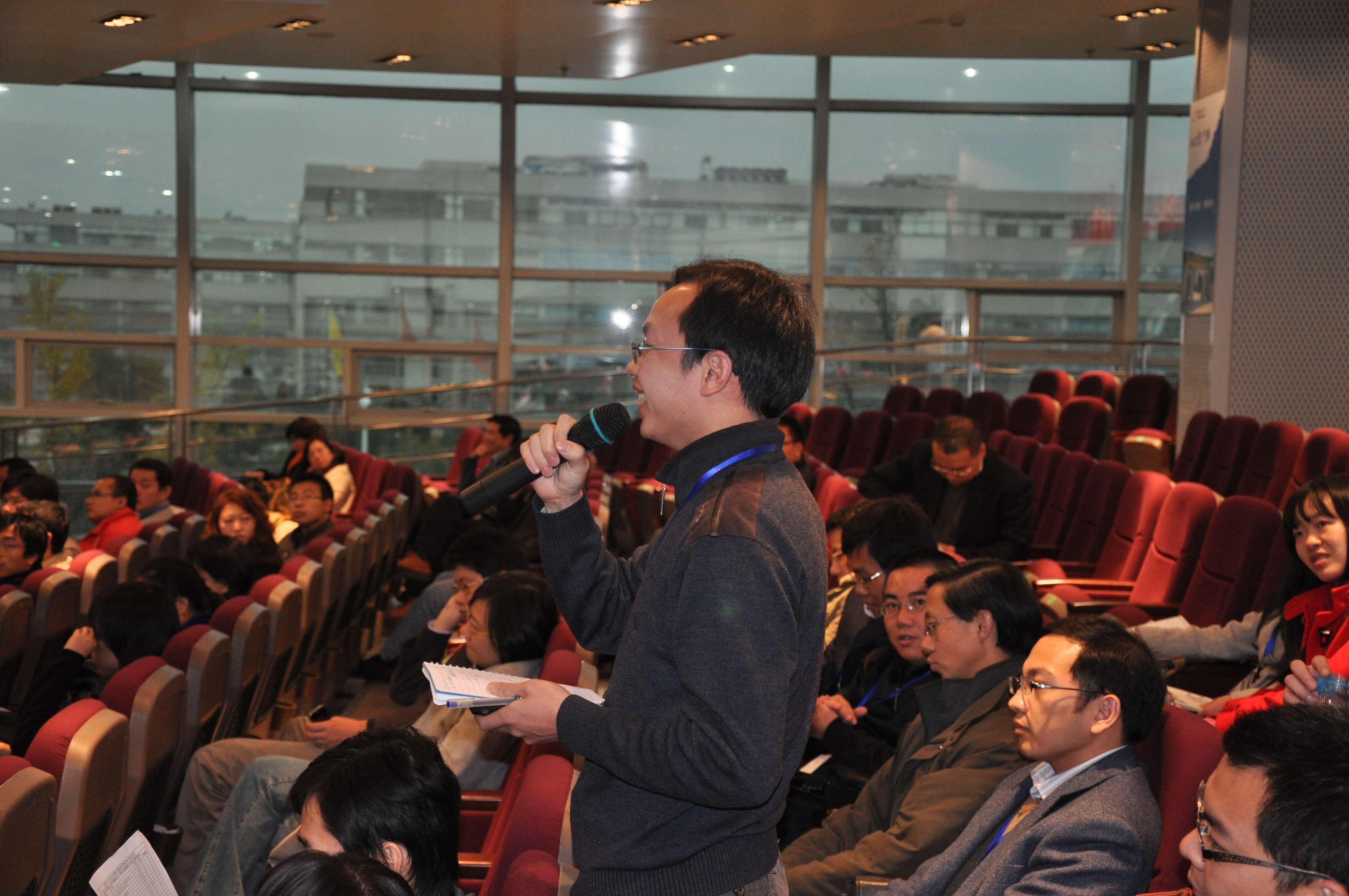 名利中国成长基金管理合伙人徐立新博士(858)提问中。徐立新来自上海,当日50名校友来自上海。上海校友在大巴车上进行自我介绍。