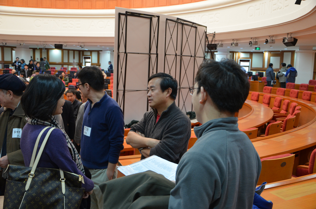 会场一角:前排为黄吉虎教授、朱东杰(校友总会秘书长);后排为王浩(794/796/7911,Array Networks中国区总经理)、魏丽萍(896,北京大学教授)、蒋澄宇、宣昌能。