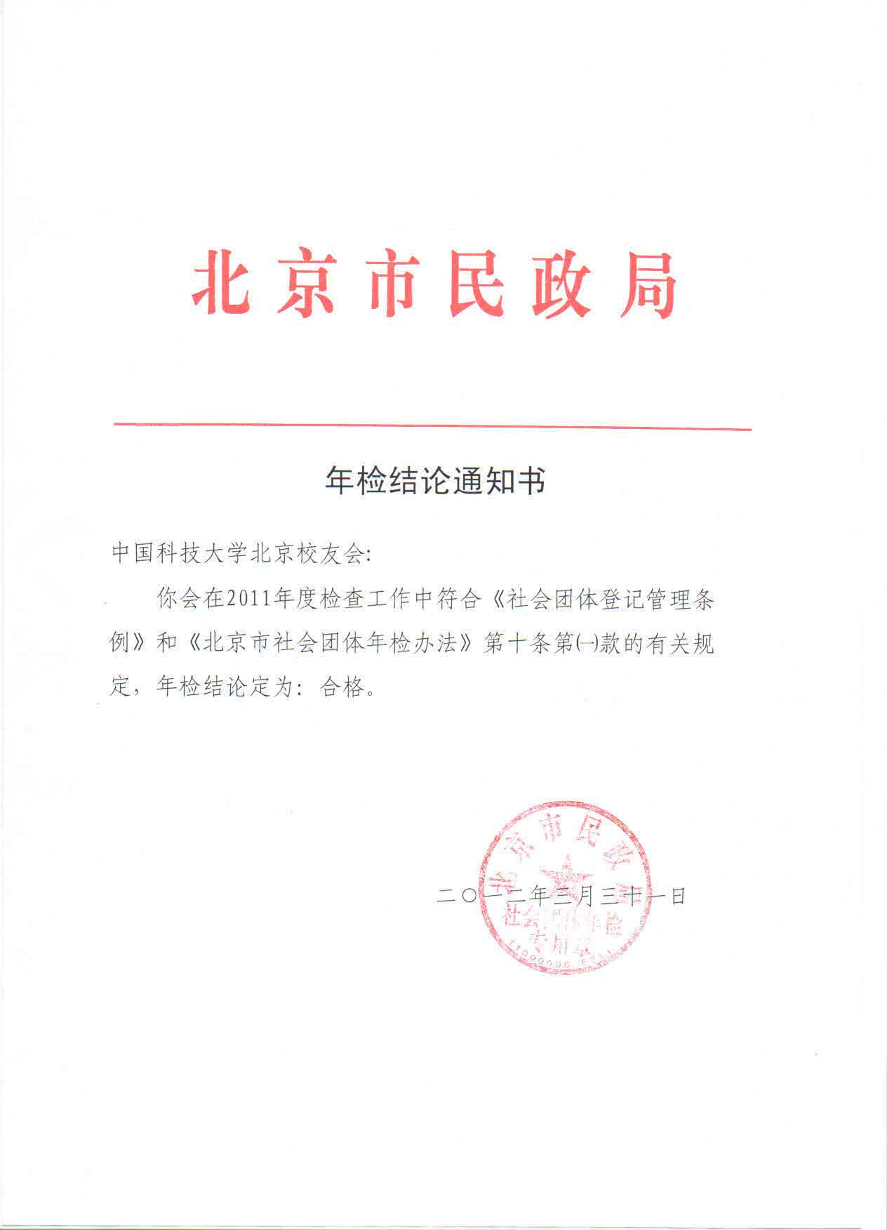2012年3月31日,中国科技大学北京校友会通过北京市民政局的社会团体2011年度年检,年检结论为“合格”。当天,北京市民政局将年检结论通知书交北京校友会。年检结论表明,2011年北京校友会的工作严格遵守国家的相关法规政策,工作规范。