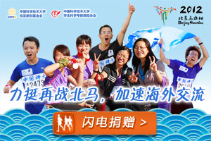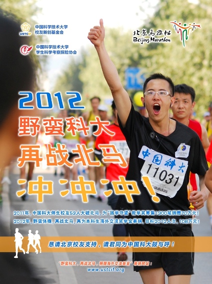 2012年是中国科大建校54周年,中国科大科学考察协会(简称科考协会)将在11月初再次挑战北京马拉松(简称北马),为中国科大“海外交流奖学金”筹款。“再战北马”行动目标是为该奖筹集人民币108万元捐赠。已有数位校友承诺捐赠上限为54万元的等额匹配捐赠,条件为: