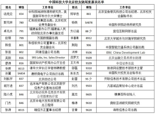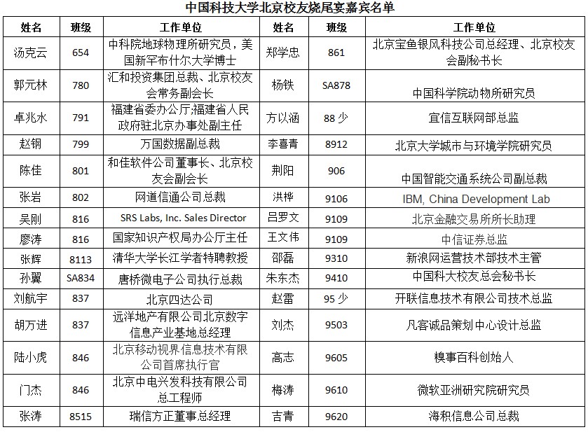 出席北京烧尾宴的校友中还有多位境外校友,包括张磊(0109,微软公司雷德蒙总部)、冷铁成(0511,新加坡管理大学)。