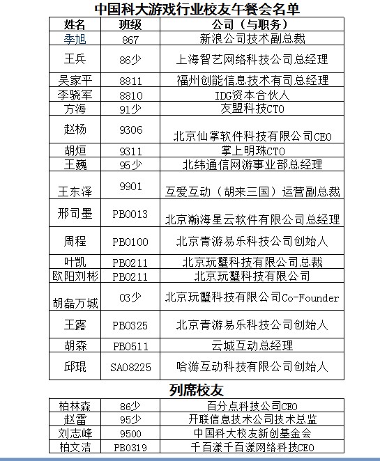 中国科大有至少100位校友供职于游戏公司,在北美他们主要供职于Zynga等在线游戏公司。在中国境内者则分布在北京、上海、福建、广东等地。除出席午餐会的校友外,淘米网络CTO魏震(9414)、上海沙舟信息科技公司CTO唐瑜(904)、昆仑万维CTO方汉(904)均为科大校友;2012年上市的广州多玩网络亦有数十名科大校友供职。