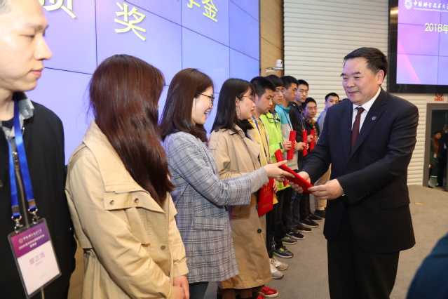 在颁奖环节,包信和校长首先为郭沫若奖学金获奖学生逐一颁发获奖证书,为获奖学生中学校长颁赠喜报,并与获奖学生及其家长、中学校长、中学和大学老师代表一同合影留念。随后,他为2018年度国家奖学金获奖学生逐一颁发证书,并合影留念。