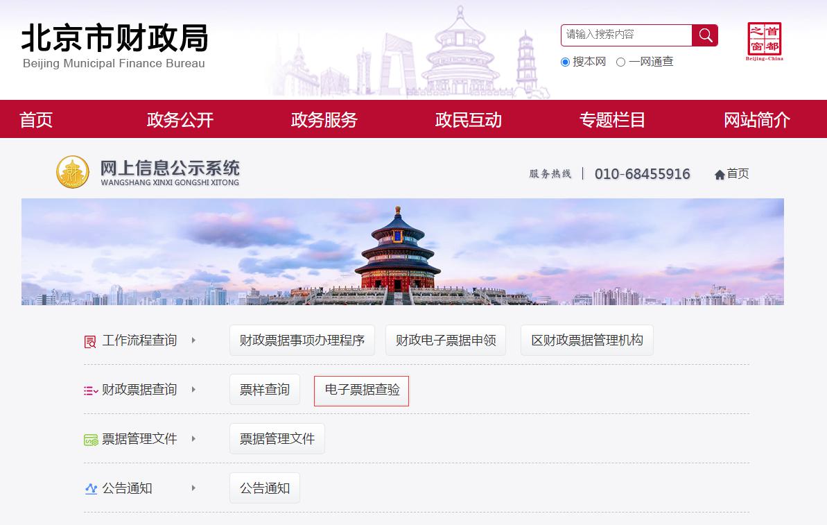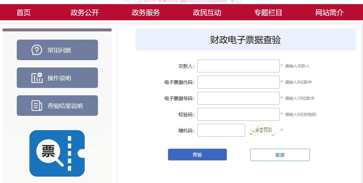 访问北京市财政局官网,左下角机构办事(票据管理),点击电子票据查验,输入交款人、电子票据代码、电子票据号码、检验码及随机码,即可点击查验。